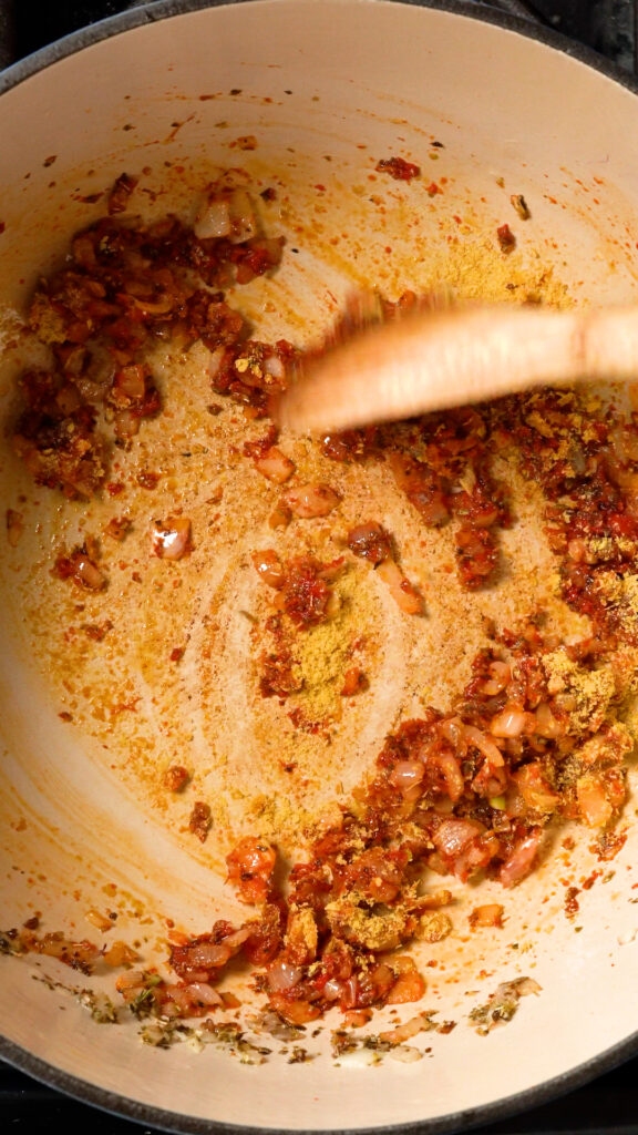 - Add the shallots, and cook for about 5 minutes, or until slightly translucent. Add in the oregano, basil, smoked paprika, nutritional yeast, tomato paste and stir to incorporate, cook for another minute.