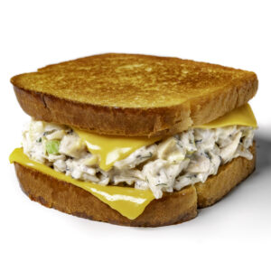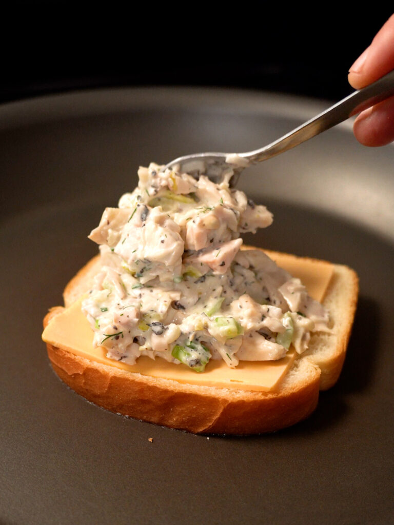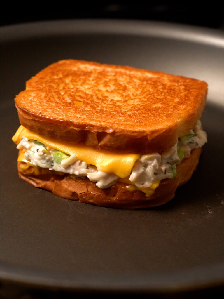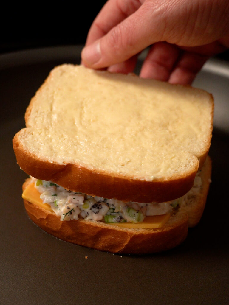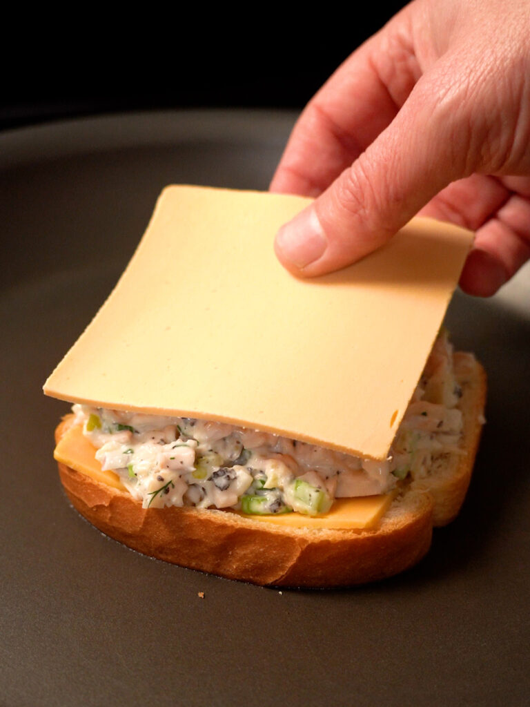 - Add a slice of the buttered bread (butter side down) to a non-stick skillet over medium low heat. Then a slice of vegan american cheese, 1/2 – 1 cup of the vegan tuna salad, another slice of cheese on top, then the other slice of buttered bread (butter side up) and then grill over medium low heat.