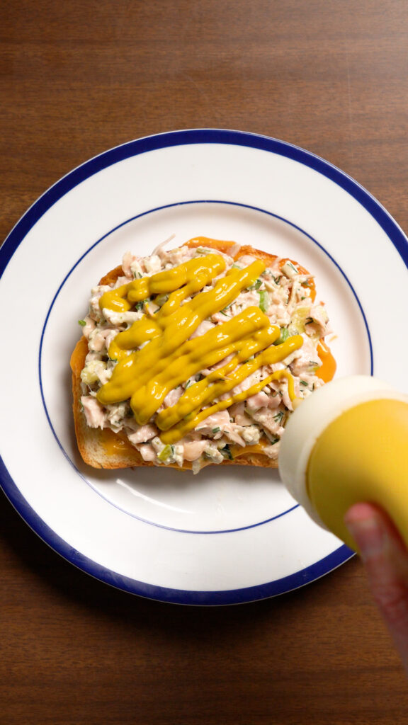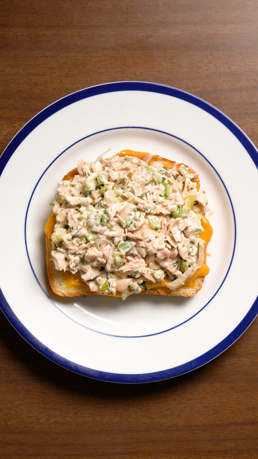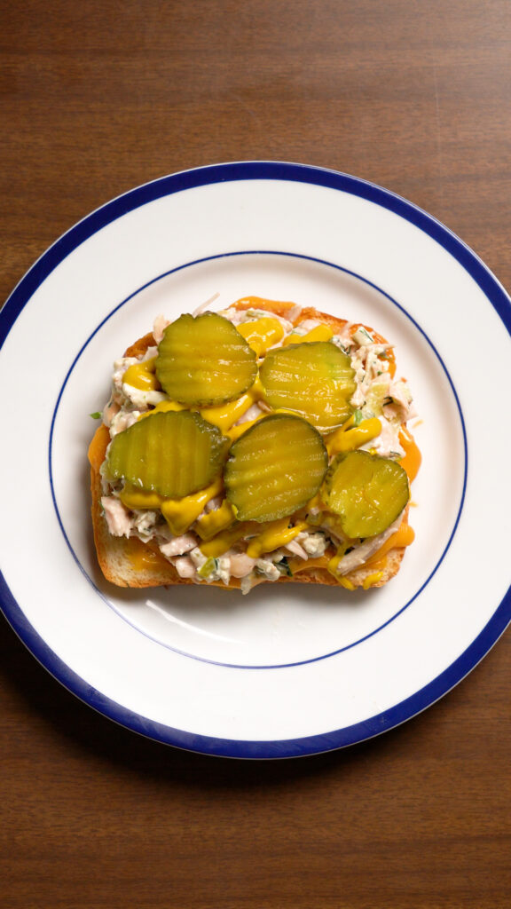 - Once the cheese is melted and the bread is golden brown, remove from the heat. Carefully pull the two pieces of bread apart. Then dress one with the vegan tuna salad, and pickles and mustard if you fancy that. Add the top bread back and enjoy!