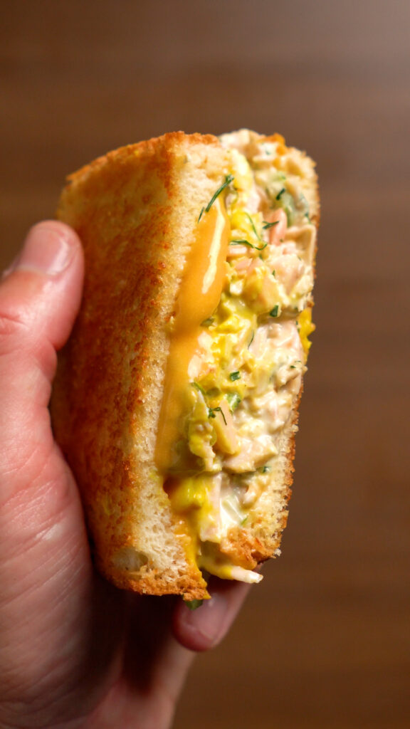 However if you don’t like to get your Tuna Salad hot, here’s another method! Basically you want to make a Grilled Cheese. Then split it open and add your cold vegan tuna salad, and if you’re like me, some mustard and pickles!